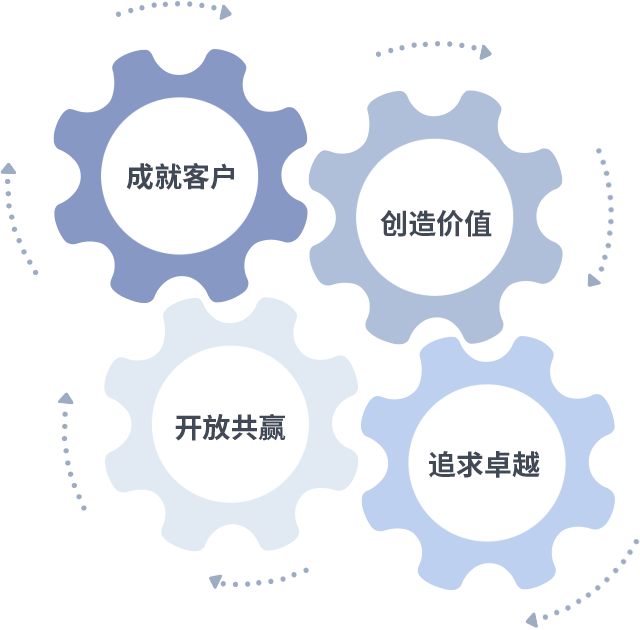 成就客户是一切决策的出发点,创造价值是衡量所有工作的标准,追求卓越是mansion88·明升做事做人的态度,开放共赢是mansion88·明升的格局也是最终的结果。价值观的齿轮环环相扣,推动着组织里的每个人不断向前。